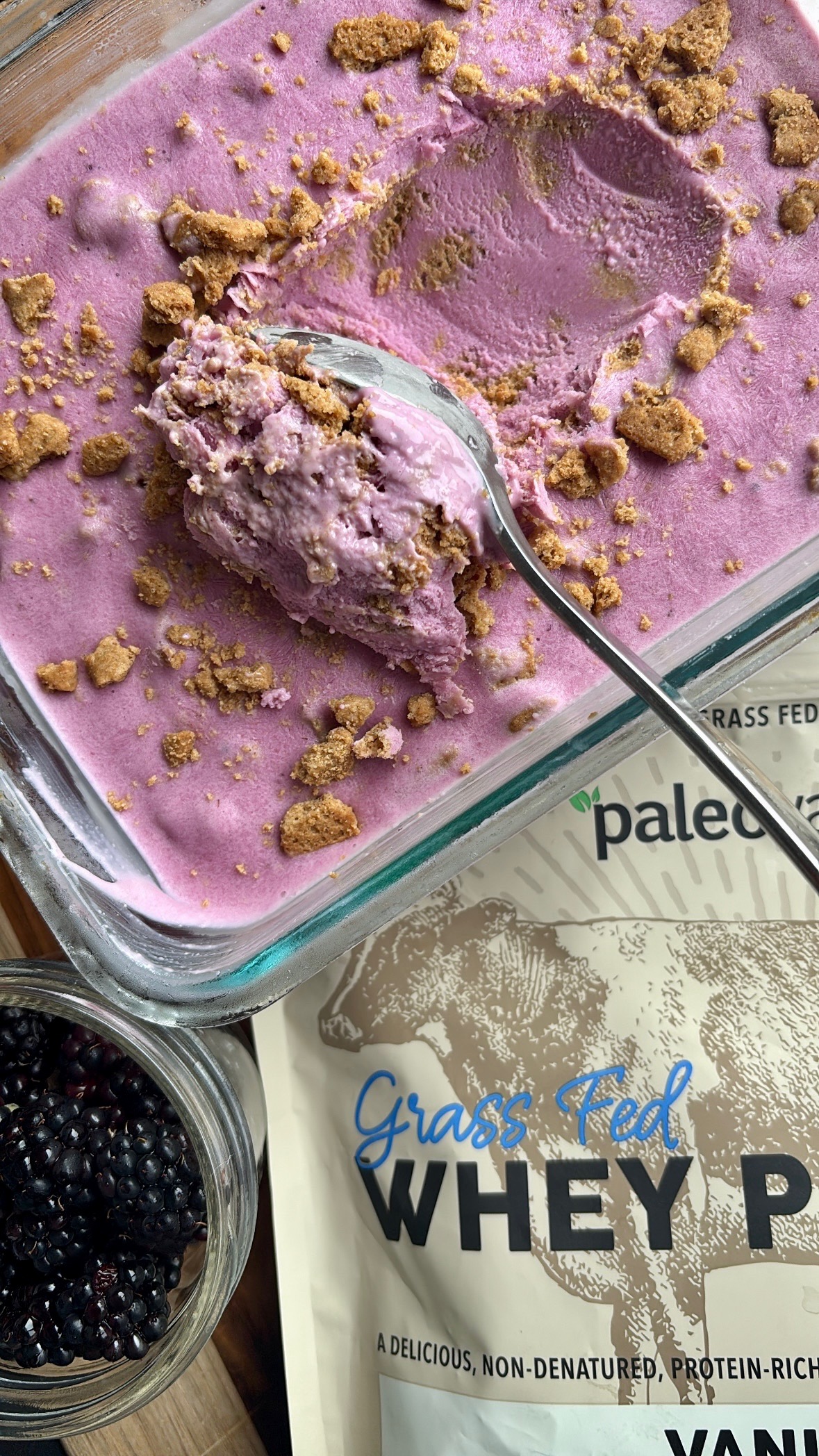 Those two things can (and should) coexist. This protein-packed, cheesecakey, deliciously creamy ice cream knocked my socks (or barefoot sandals) off, and I am hooked. the girls agree, and this will now be a summer-long staple. I am extra happy about that because it’s protein-packed thanks to Paleovalley’s vanilla whey protein powder and a whole carton of cottage cheese, filled with antioxidants from locally picked berries, and a great sweet treat that also nourishes my girls and me after a fun day of exploring, play, and life.